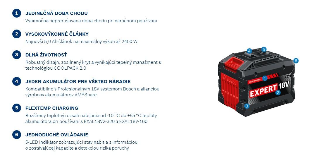 Rozšírený rozsah nabíjacích teplôt od -10 °C do +55 °C teploty akumulátora pri použití EXPERT EXAL18V2-320 a EXPERT EXAL18V-160