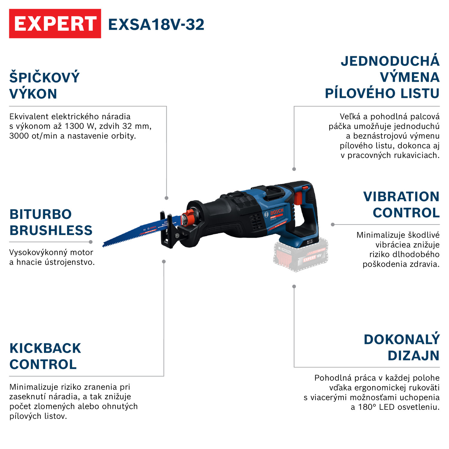 Chvostová píla EXPERT EXSA18V-32 poskytne vynikajúci výkon ekvivalentný elektrickému náradiu triedy 1300 W, má zdvih 32 mm a 3000 ot/min. Technológia BITURBO Brushless, vysokovýkonný motor a hnacie ústrojenstvo sú dokonale navrhnuté na skvelé využívanie extrémneho výkonu akumulátorov EXPERT. Píla má pokročilú ochranu používateľa: Funkcia KickBack Control minimalizuje riziko zranenia pri zaseknutí náradia. Prispieva to k redukcii prípadov zlomenia alebo ohnutia pílového listu. Má pasívnu a aktívnu reguláciu vibrácií s funkciou Vibration Control – tá minimalizuje škodlivé vibrácie a znižuje riziko únavového zranenia – ako aj funkciu Stop Control, ktorá automaticky vypne náradie po dokončení rezania. Táto chvostová píla má veľké a pohodlné palcové pádlo na rýchlu a jednoduchú beznástrojovú výmenu pílového listu – dokonca aj v pracovných rukaviciach. Vďaka 180-stupňovému LED svetlu bude pracovný priestor dokonale osvetlený. Špičkový dizajn s ergonomickou rukoväťou s viacerými polohami uchopenia uľahčí pohodlnú prácu v mnohých rôznych polohách.