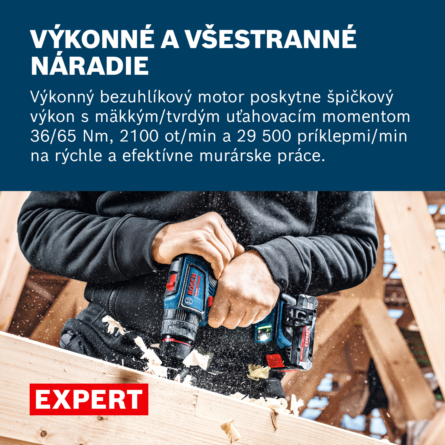 EXPERT EXSB18V-90 je výkonný akumulátorový príklepový vŕtací skrutkovač. Toto špičkové všestranné náradie s bezuhlíkovým motorom poskytne špičkový výkon s mäkkým uťahovacím momentom 36 Nm a tvrdým uťahovacím momentom 56 Nm, 2 100 ot/min a 29 500 príklepov/min na rýchle a efektívne murárske práce. Tento kompaktný silák má dĺžku hlavy 175 mm s 13 mm kovovým skľučovadlom na vyššiu robustnosť a skvelý prenos momentu. Má pokročilú ochranu používateľa: Funkcia KickBack Control minimalizuje riziko zranenia zastavením motora pri zaseknutí vrtáka. Túto funkciu je možné zapnúť a vypnúť. Presná spojka zabezpečí maximálnu kontrolu náradia, prestane zaberať, keď je to potrebné, a poskytne voľnosť pri nastavovaní náradia presne podľa vašich potrieb. Redukuje sa tiež opotrebovanie spojky a z toho vyplývajúca hlučnosť.