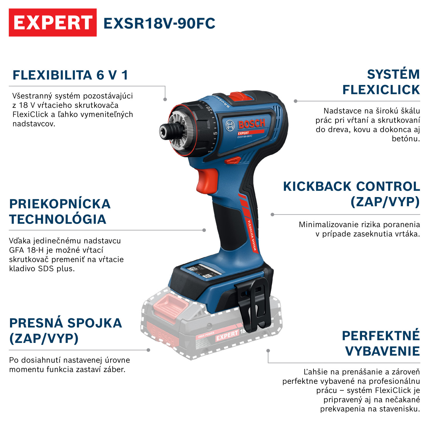 Výkonné náradie EXPERT EXSR18V-90FC poskytne flexibilitu 6 v 1 vďaka ľahko vymeniteľným nadstavcom na vŕtanie a skrutkovanie. Je súčasťou všestranného systému Bosch Professional FlexiClick, ktorý je pripravený na rôzne výzvy na stavenisku. Jedinečný príklepový nadstavec GFA 18-H premení náradie na vŕtacie kladivo SDS plus, ktoré bude pripravené na príklepové vŕtanie do betónu s Ø až do 10 mm. Náradie má pokročilú ochranu: Funkcia KickBack Control Funkcia minimalizuje riziko zranenia pri zaseknutí vrtáka. Funkcia presnej spojky po dosiahnutí nastavenej úrovne momentu zastaví záber. Obe funkcie je možné zapnúť a vypnúť. Systém FlexiClick redukuje hmotnosť náradí, ktoré musíte nosiť na staveniská. Nadstavce FlexiClick dokážu na príležitostné použitie nahradiť špecializované náradie. FlexiClick System Bosch Professional – vynikajúco pripravený na profesionálnu prácu.