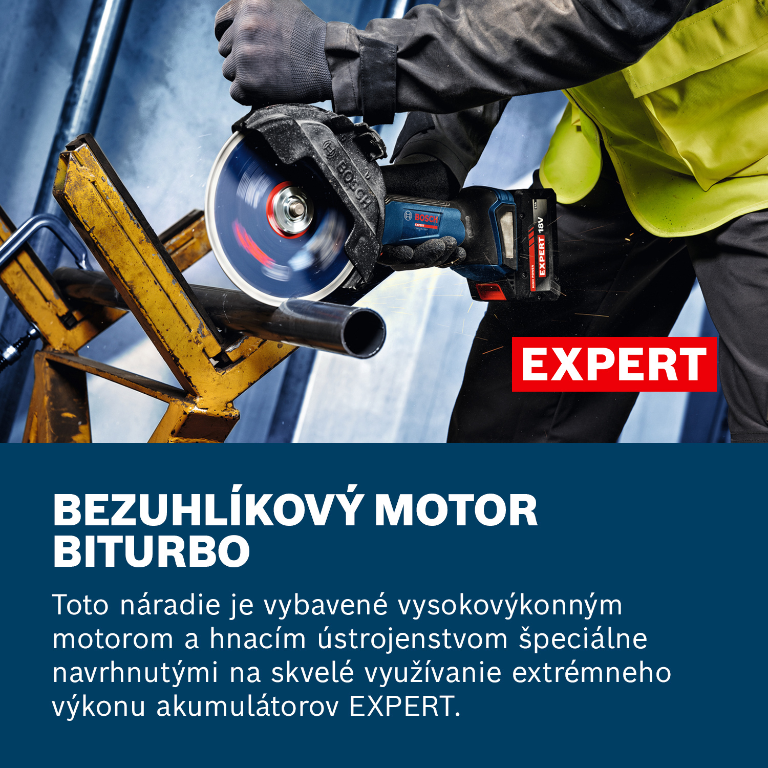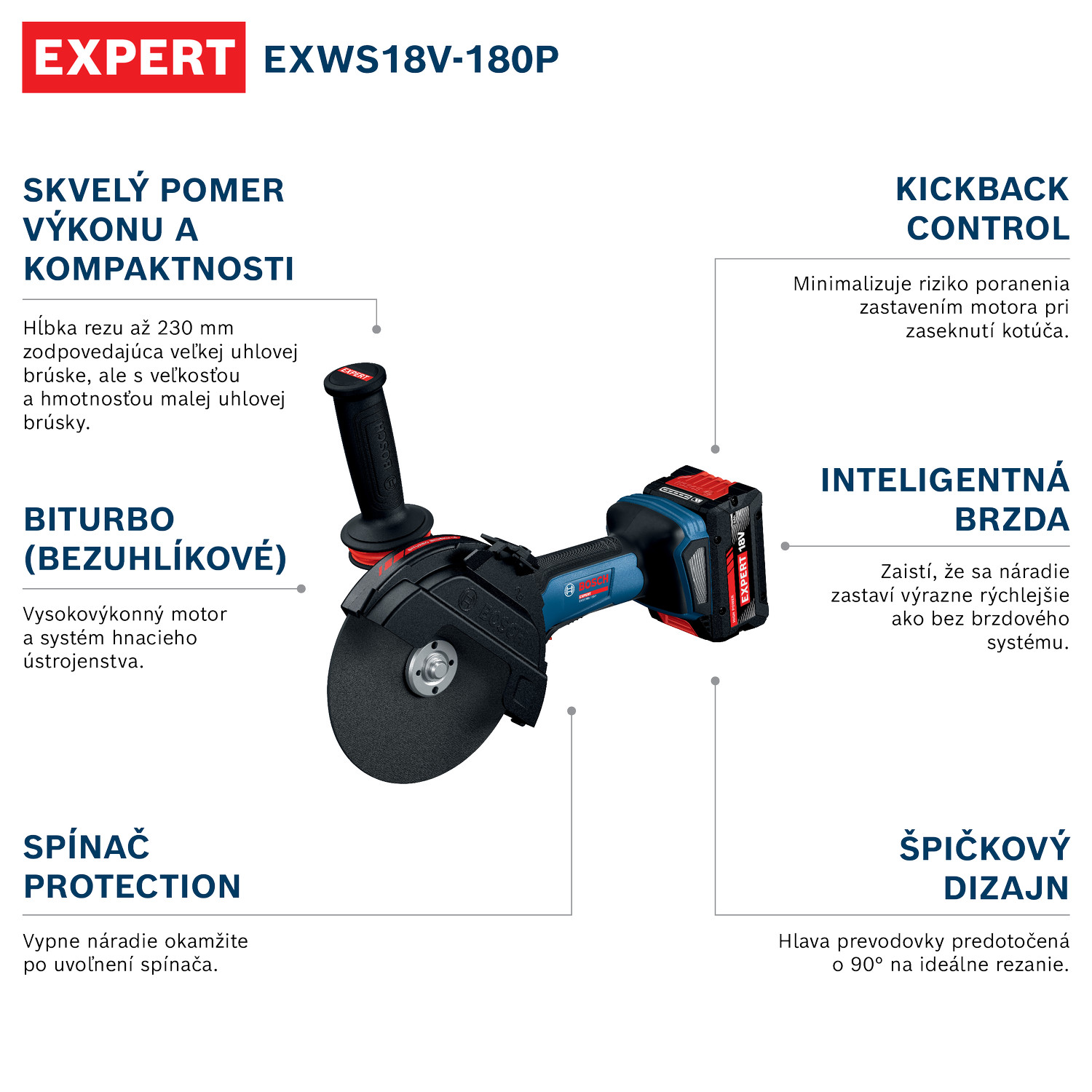 Špičková uhlová brúska EXPERT EXWS18V-180P poskytne dokonalý pomer kompaktnosti, hĺbky rezu a ochrany. Ponúka extrémnu hĺbku rezu ako 230 mm veľká uhlová brúska v kombinácii s kompaktnými rozmermi a hmotnosťou malej uhlovej brúsky. Technológia BITURBO Brushless, vysokovýkonný motor a hnacie ústrojenstvo sú dokonale navrhnuté na skvelé využívanie extrémneho výkonu akumulátorov EXPERT. Uhlová brúska má pokročilú ochranu používateľa: spínač PROtection vypne náradie ihneď po uvoľnení spínača. Funkcia KickBack Control minimalizuje riziko zranenia pri zaseknutí kotúča a inteligentná brzda zaistí, že sa náradie zastaví podstatne rýchlejšie ako bez akéhokoľvek brzdového systému. Toto náradie má vynikajúcu konštrukciu s pred-otočenou hlavou prevodovky o 90 stupňov, vďaka čomu je ideálne na akékoľvek rezanie.