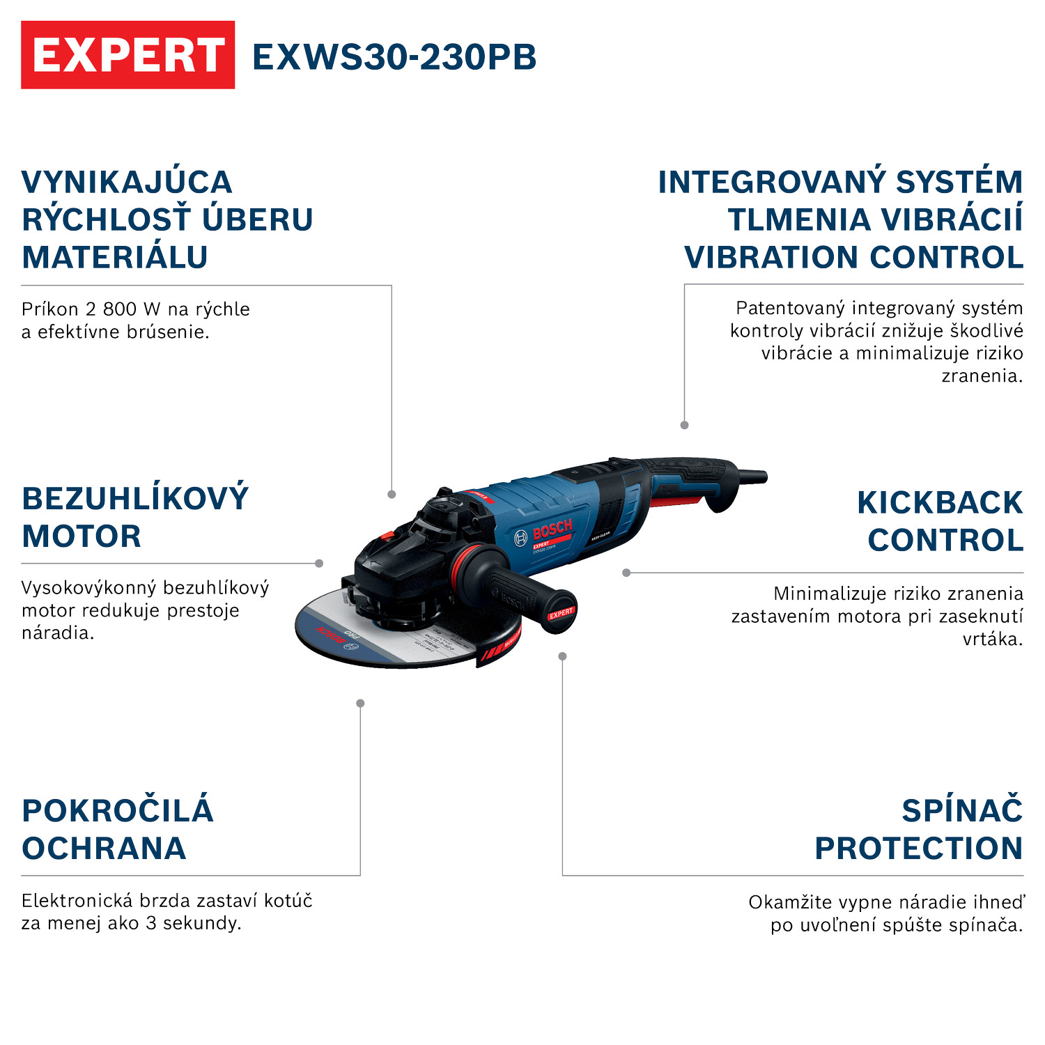 EXPERT EXWS30-230B poskytuje vysokú mieru úberu materiálu vďaka 2800 W bezuhlíkovému motoru, ktorý zároveň znižuje frekvenciu potreby údržby vďaka nižšiemu počtu opotrebovaných dielov a nevyužívaniu uhlíkov. Toto náradie poskytuje všestrannú bezpečnosť a praktickosť s elektronickou brzdou, ktorá zastaví kotúč za menej ako 3 sekundy, funkciou KickBack Control, ochranou proti opätovnému spusteniu a plynulým spustením. Práca bude vďaka integrovanému systému Vibration Control, ktorý minimalizuje vibrácie, menej únavná.